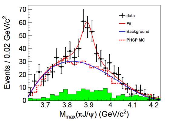 的质量谱上发现了含有至少四夸克的带电类粲偶素Zc(3900)Phys. Rev. Lett 110, 252002 (2013) 。该论文被Phys. Rev. Lett 编辑选为推荐阅读论文,受到了Nature,Cern Courier等杂志进行了热点报道。研究成果也被美国物理学会主办的《Physics》杂志评为2013年物理领域十一项研究成果热点之首【Physics 6, 139(2013)】