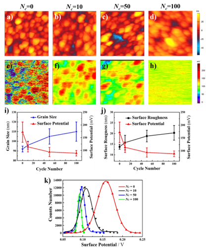 锂离子电极材料随循环次数演变的表面形貌和表面电势分布图像