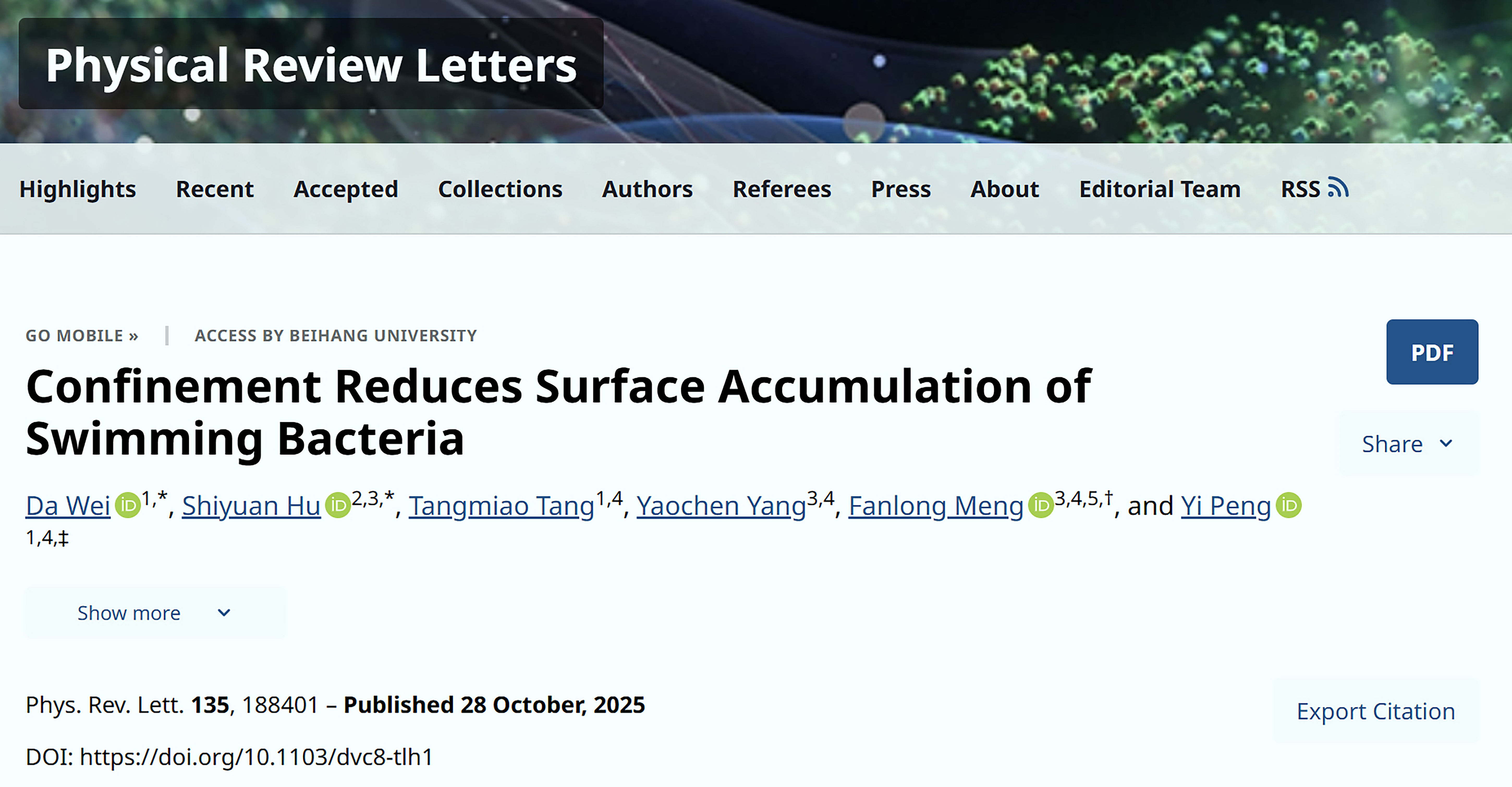 近日,北航物理学院胡世渊副教授与合作实验课题组在《Physical Review Letters》上发表了题为“Confinement Reduces Surface Accumulation of Swimming Bacteria”的论文。