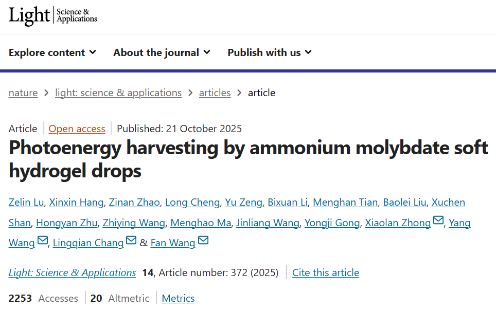 近日,北航物理学院纳米光子学实验室的王帆教授与钟晓岚教授科研团队,在基于电子-离子调控的能量转化领域取得重要进展,相关研究成果以“Photoenergy harvesting by ammonium molybdate soft hydrogel drops”为题,发表于《Light: Science & Applications》上。物理学院博士生卢泽霖为该论文的第一作者,钟晓岚教授、王帆教授以及生物与医学工程学院的王杨副教授、常凌乾教授为该论文的通讯作者。