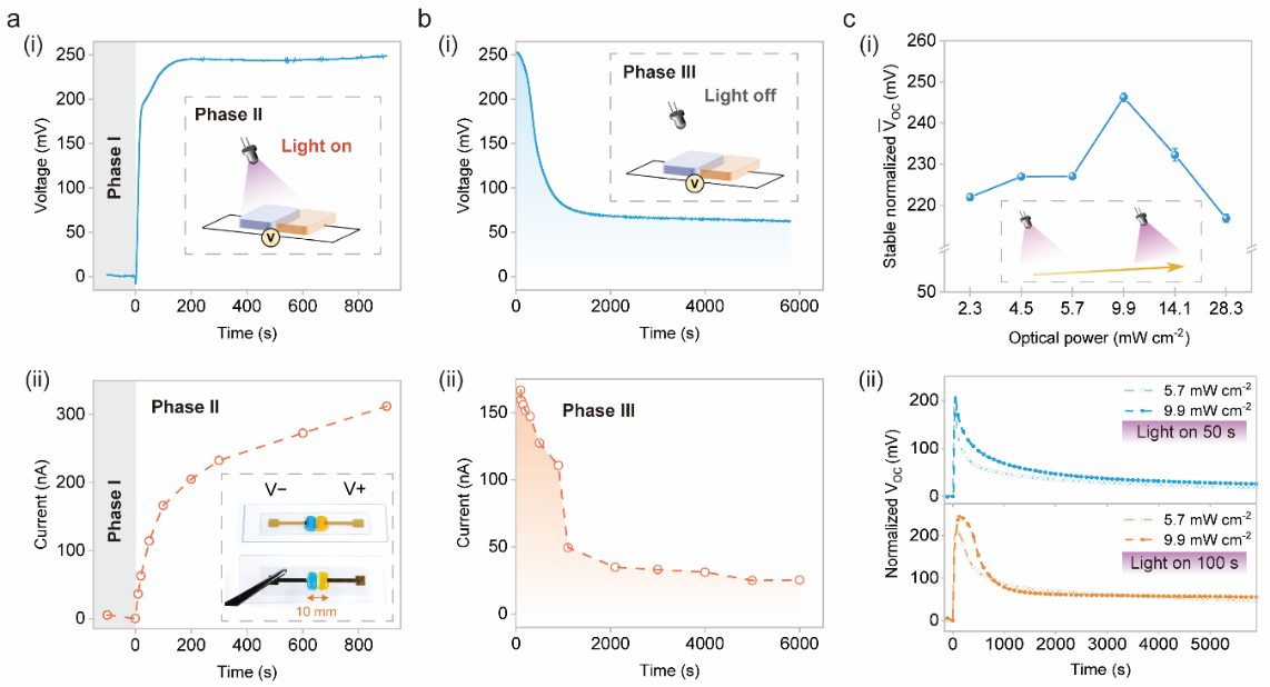 在该工作中,王帆教授与钟晓岚教授的科研团队受自然界生物系统中的能量转化过程启发,创新性的提出了一种基于离子水凝胶液滴的光能收集器件,为解决这一难题提供了潜在的解决方案。该技术通过利用光诱导的离子梯度和氧化还原对变化来产生电力,而可逆的水凝胶网络能够支持制造出任意的结构。实验结果表明,该水凝胶光能收集器经过100s激发后,即可达到~250 mV的电压与~160 nA的电流。不同于典型的光电器件,该收集器在移除激发光源5000s后,由于带电粒子扩散与氧化还原对的恢复过程时间尺度较长,输出性能依旧保持有约75 mV与20 nA。在不同光功率条件下的输出性能结果表明,即使在较低的激发功率下,该器件也能产生可观的输出,有效的完成光能的收集与转换。